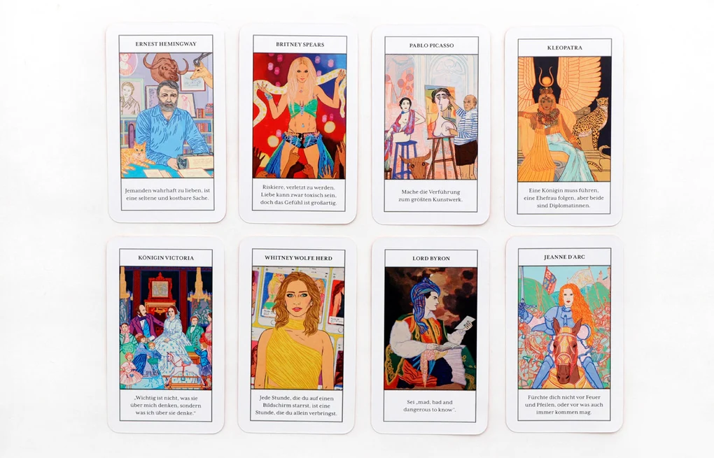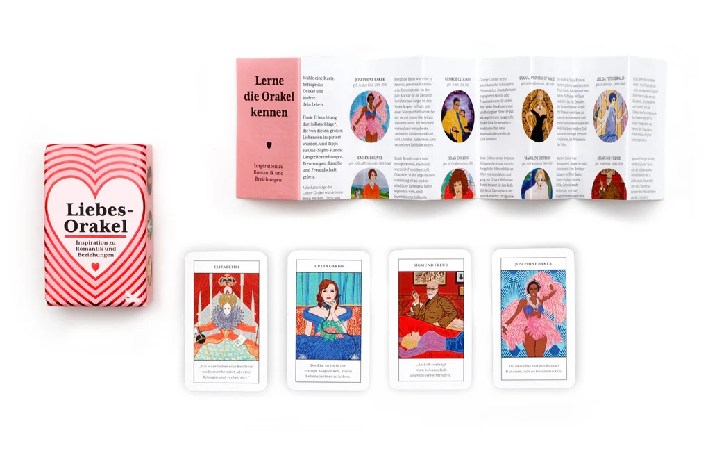 Zweifelt ihr an eurer Verführungskraft? Sucht ihr euch immer wieder toxische Partner*innen? Möchtet ihr eure sozialen Beziehungen verbessern? Eine Vielzahl berühmter Liebhaber*innen sind in diesem Kartendeck versammelt, um euch zu helfen. Wählt einfach eine Karte aus, befolgt die Ratschläge von Elizabeth Taylor, Jane Austen oder Lord Byron, und jedes Hindernis wird überwindbar. Mit wunderschönen Illustrationen und einem Leaflet mit Kurzbiografien.