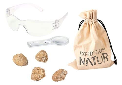 Echte Schätze für wissbegierige Kinder: In den umfangreichen Ausgrabungssets der Reihe Expedition Natur können Nachwuchs-Forscher*innen echte Fossilien, Kristalle und Mineralien entdecken und dabei jede Menge lernen. Richtige Fossilien freilegen wie Paläontolog*innen, das glitzernde Innere der Geoden mit einem geschickten Hammerschlag ans Tageslicht bringen oder sich aus den selbst ausgegrabenen Mineralien einen Glücksbringer basteln – diese Sets enthalten neben den wertvollen Schätzen viele praktische Extras. Neben Schutzbrille, Werkzeug oder Aufbewahrungsbeutel liegt jedem Set ein ausführliches Booklet mit spannenden Infos und kindgerechten Erklärungen rund um Fossilien, Geoden oder Mineralien bei.