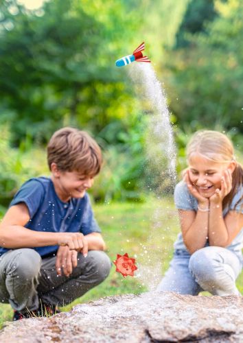 3, 2, 1... und los! Diese coole Rakete ist sofort startklar. Als Treibstoff werden nur zwei simple–– Zutaten aus der Küche benötigt, und schon schießt die Rakete von der Station: Einfach Haushaltsessig und Backpulver hinzufügen und die rotblaue Kunststoffrakete startet ihren Flug. Doch wie kann das funktionieren? Im Inneren der Verpackung wird kindgerecht erklärt, welche chemische Reaktion die Rakete fliegen lässt und welche Rolle CO₂ dabei spielt. Spielspaß und Wissensvermittlung werden hier spannend kombiniert!